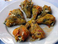 flour, onions and whatever secret recipe the chef knows. Stuffed zucchini or kolokithea gemista is another popular dish and like tomatoes and peppers you need to ask if it is with meat or without. Unlike the other gemista, kolokithea is usually served with avgolemono sauce, the egg lemon sauce which also flavors lamb fricasse and the egg-lemon soup that is to my family as chicken soup is to others when you have a cold or flu. Aginares (artichokes) are also served