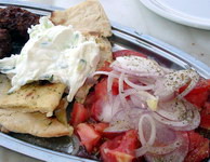 and though you can find vegetarian versions in hip restaurants like Eden in the Plaka it is pretty much a meat dish though in Aglaia Kremezi's FOODS OF GREECE she has a recipe for vegetarian mousaka as does Cindy Econopouly in her DIET OF THE GODS Greek entrée cookbook. Melitzana salata (photo) is a dip made from roasted eggplant, onions, garlic, peppers and can be found in most restaurants. There are usually two versions, one with mayo and one with oil and vinegar. Often the mayo version comes